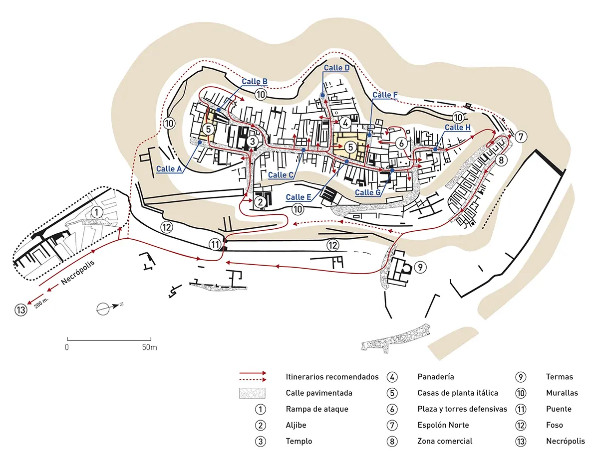 Pronto se hizo patente la influencia de Roma en esta ciudad, apareciendo edificios como las termas y el templo a finales del siglo II o comienzos del I antes de Cristo. Además, algunas viviendas abandonaron el modelo tradicional de la casa ibérica, adoptando la planta y la distribución de casas romanas, con un patio a cielo abierto en el centro.