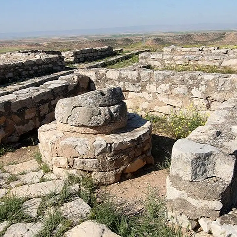 A los pies del extremo norte de la acrópolis se encuentra un barrio comercial, completamente excavado, en cuyas casas se conservan numerosas balsetas de yeso.